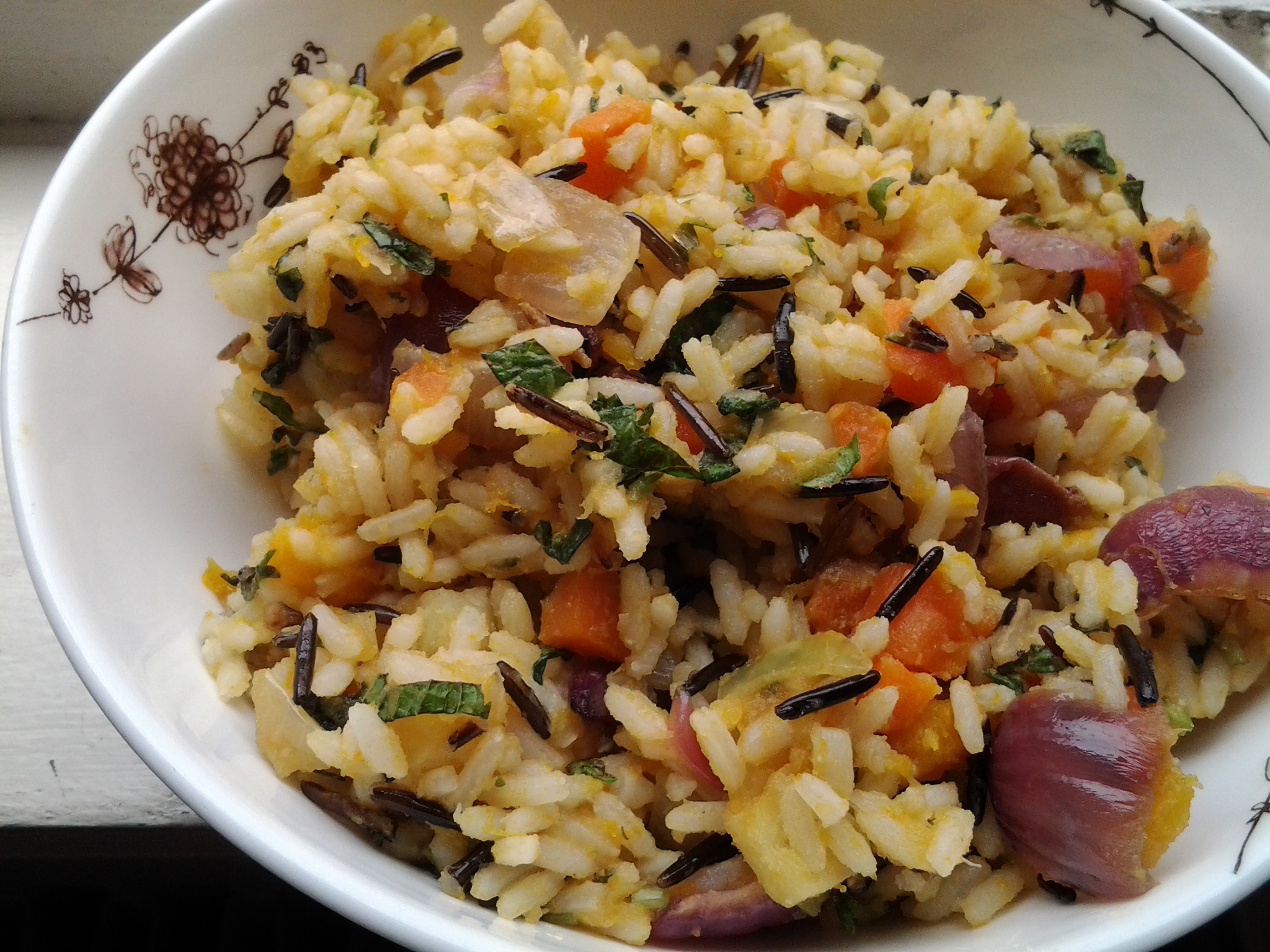Wild Rice Salad with pumpkin, red onion, basil, and mint.