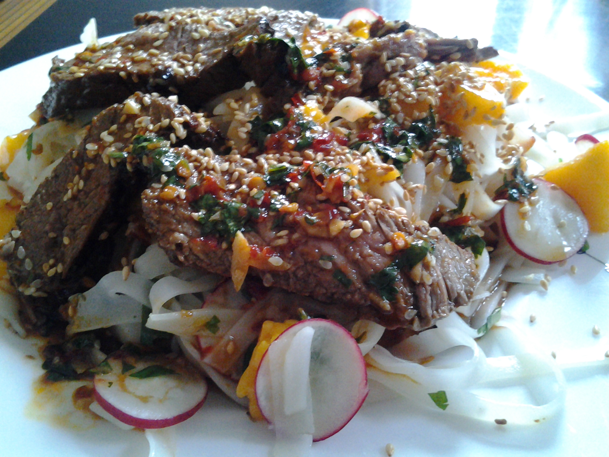 Thai Steak Salad with mango, radishes, cilantro, roasted sesame seeds, and rice noodles.