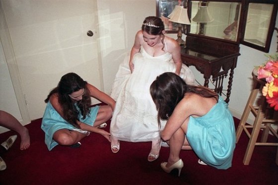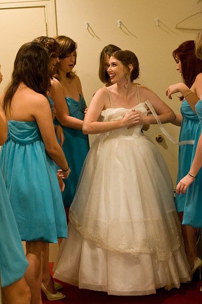 My bridesmaids helping me get dressed!