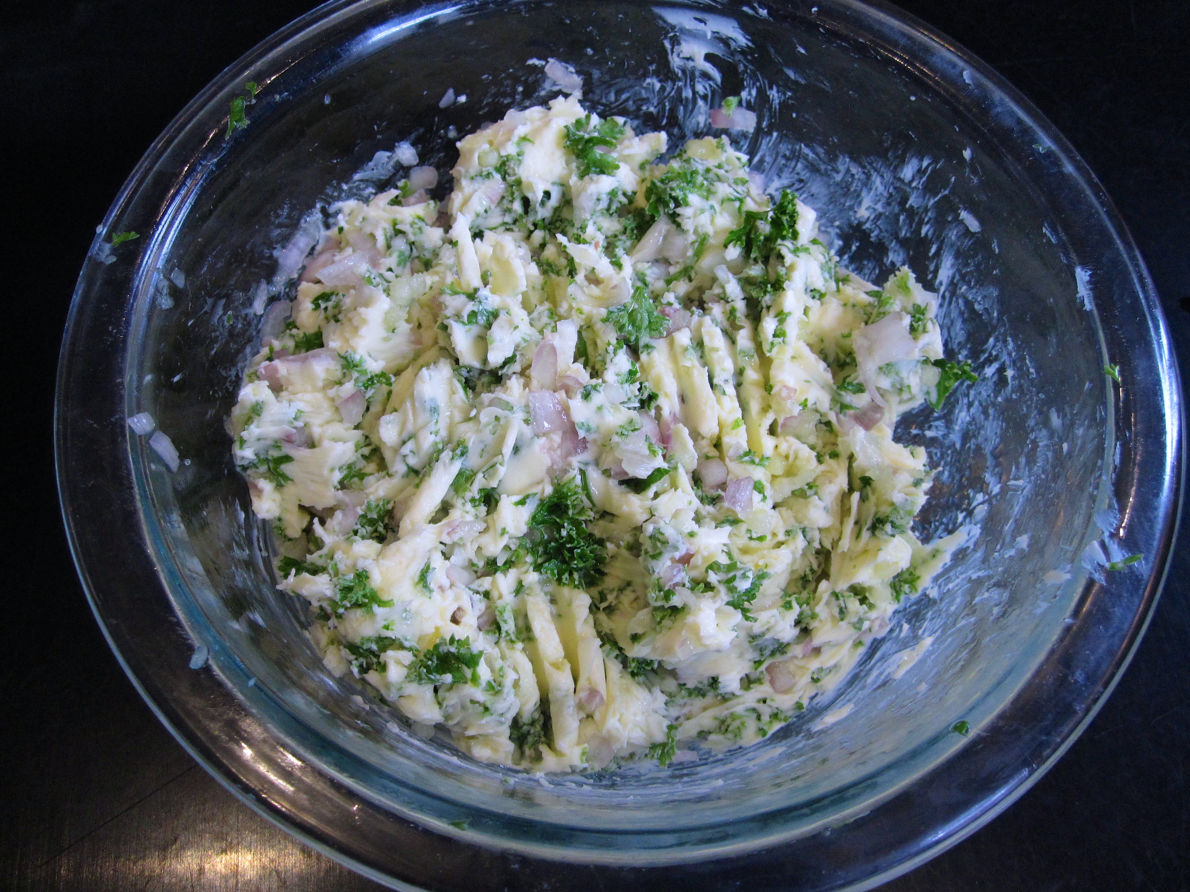 Tomate aux crevettes is one of my favorite Belgian dishes! It is not difficult to make and the simplicity of the flavors is what makes it so great. Hollowed tomatoes are filled with a mixture of North Sea shrimp, mayonnaise, Worstershire sauce, lemon juice, and tabasco – or at least that’s how Koen and I make it. You can use store bought mayonnaise, but for last night’s dinner, Koen made it fresh from scratch and you can taste the difference! Traditionally tomate aux crevettes is paired with french fries, but we were in the mood for bread. To top the bread, I made a garlic butter made of butter, garlic, shallots, and parsley. Perfect combo!