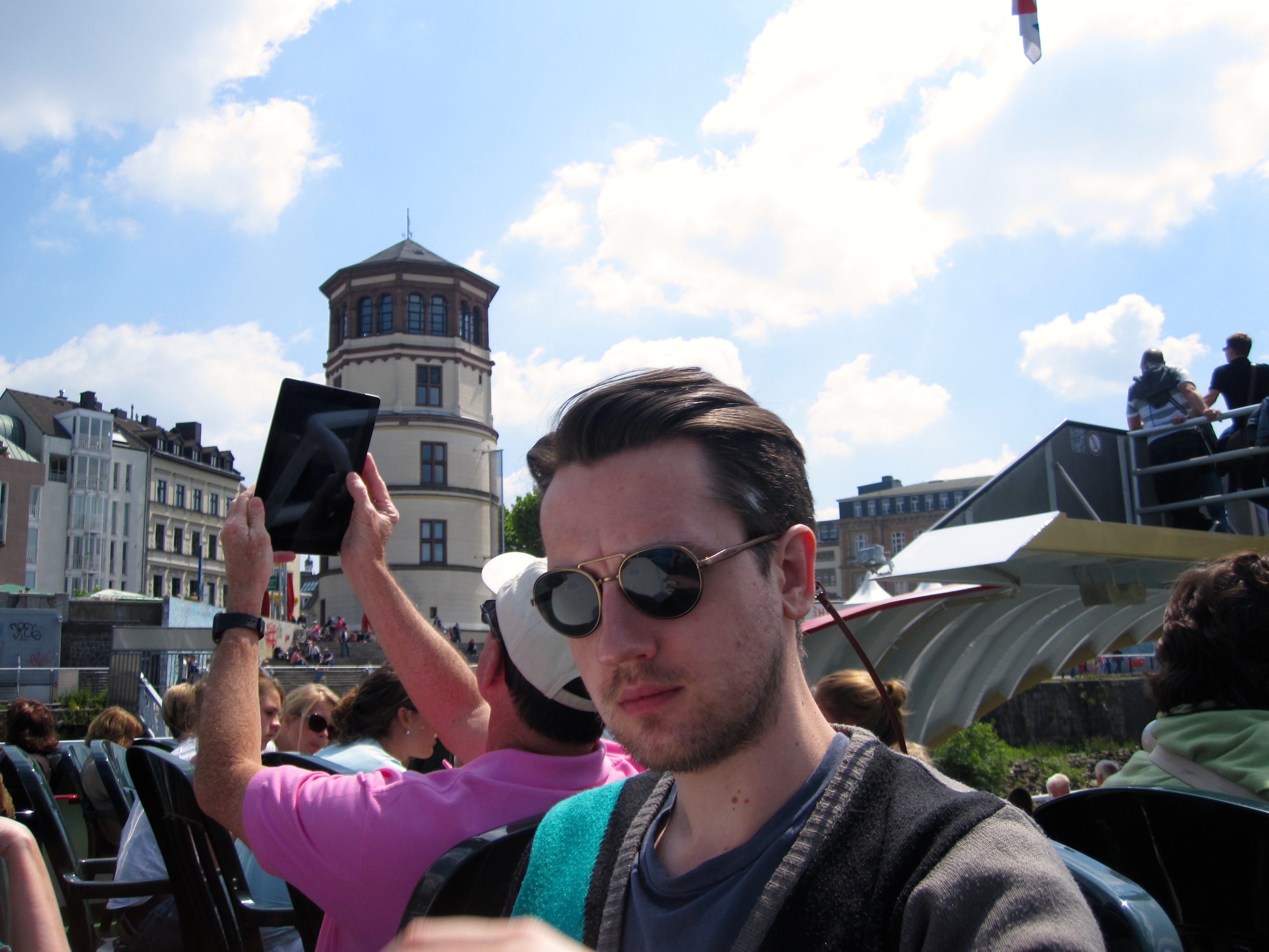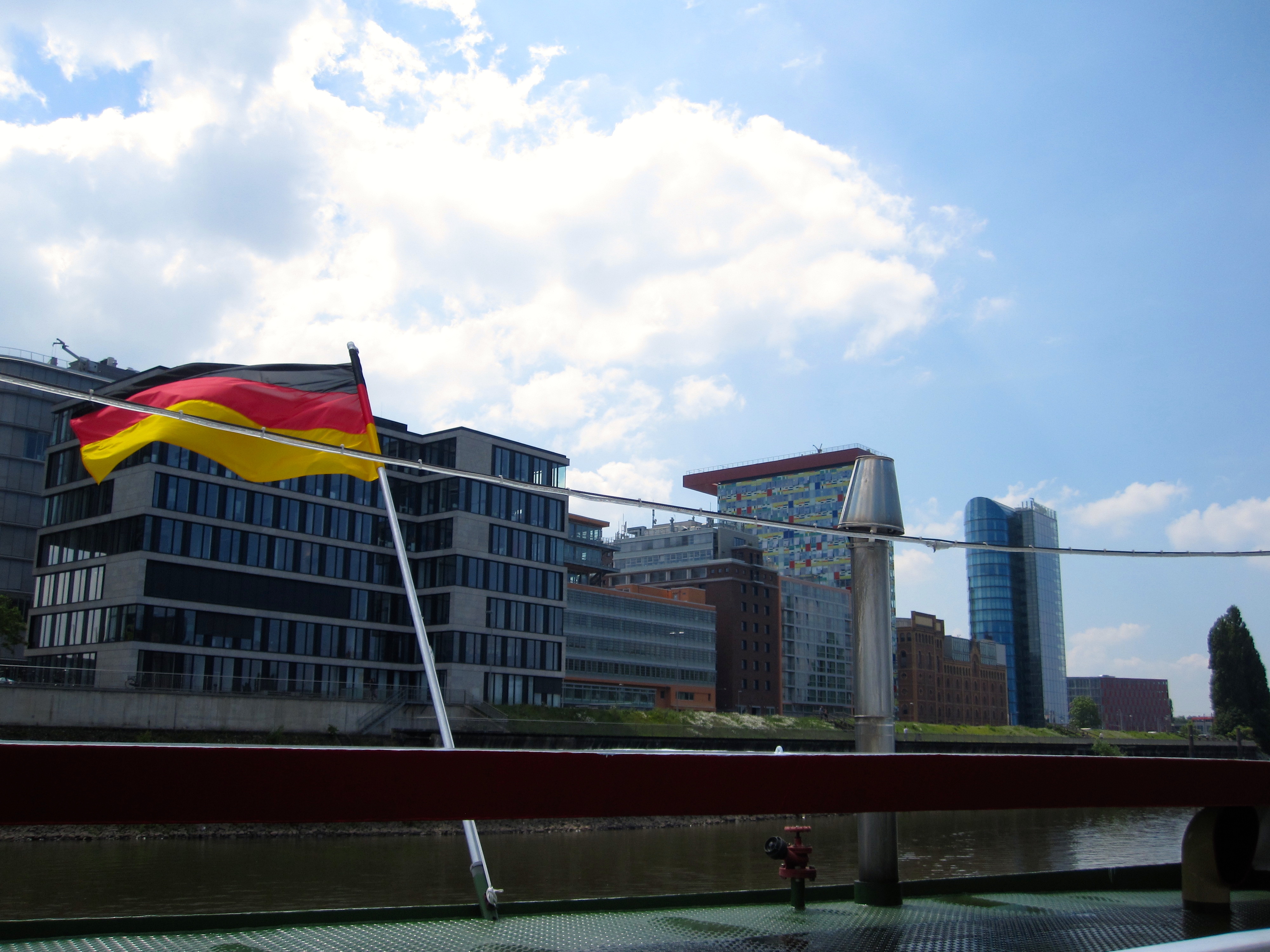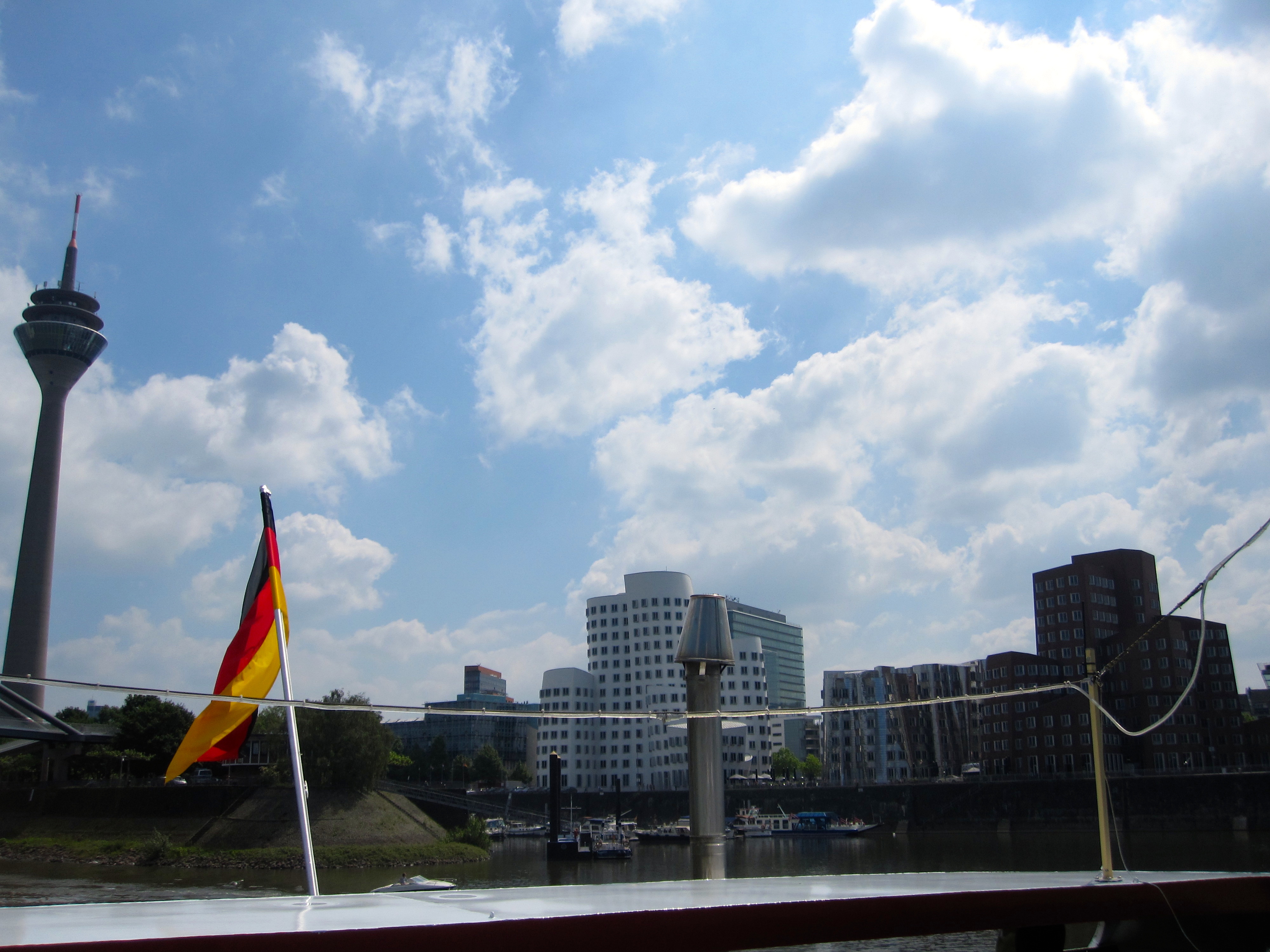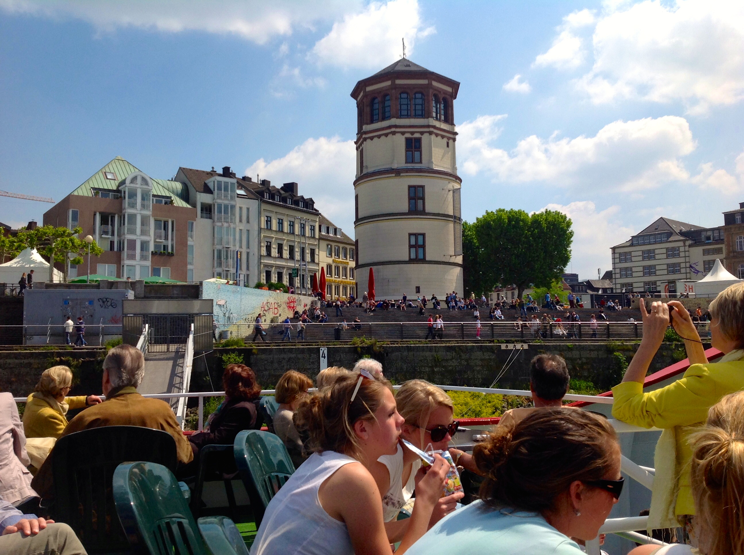 View of the Lambertus-Basilika, the oldest building in Düsseldorf (with a slightly crooked tower), and the Schlossturm from the boat