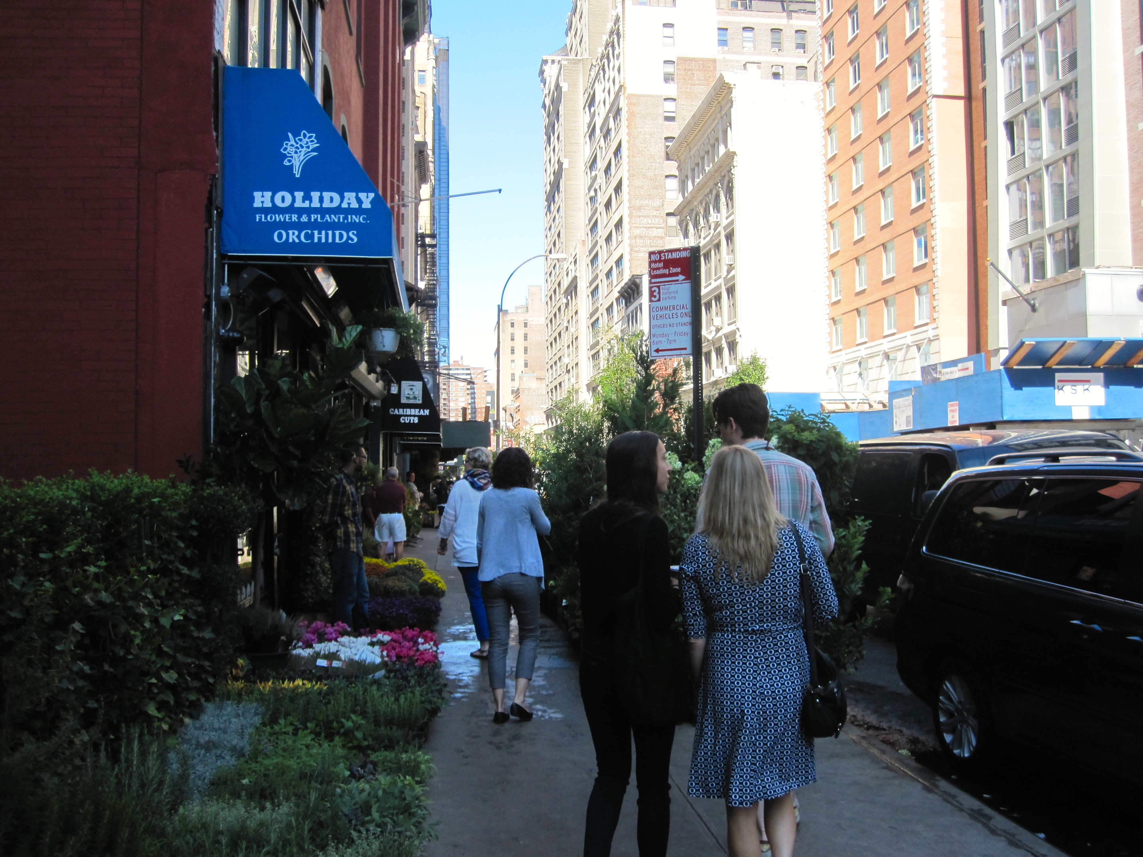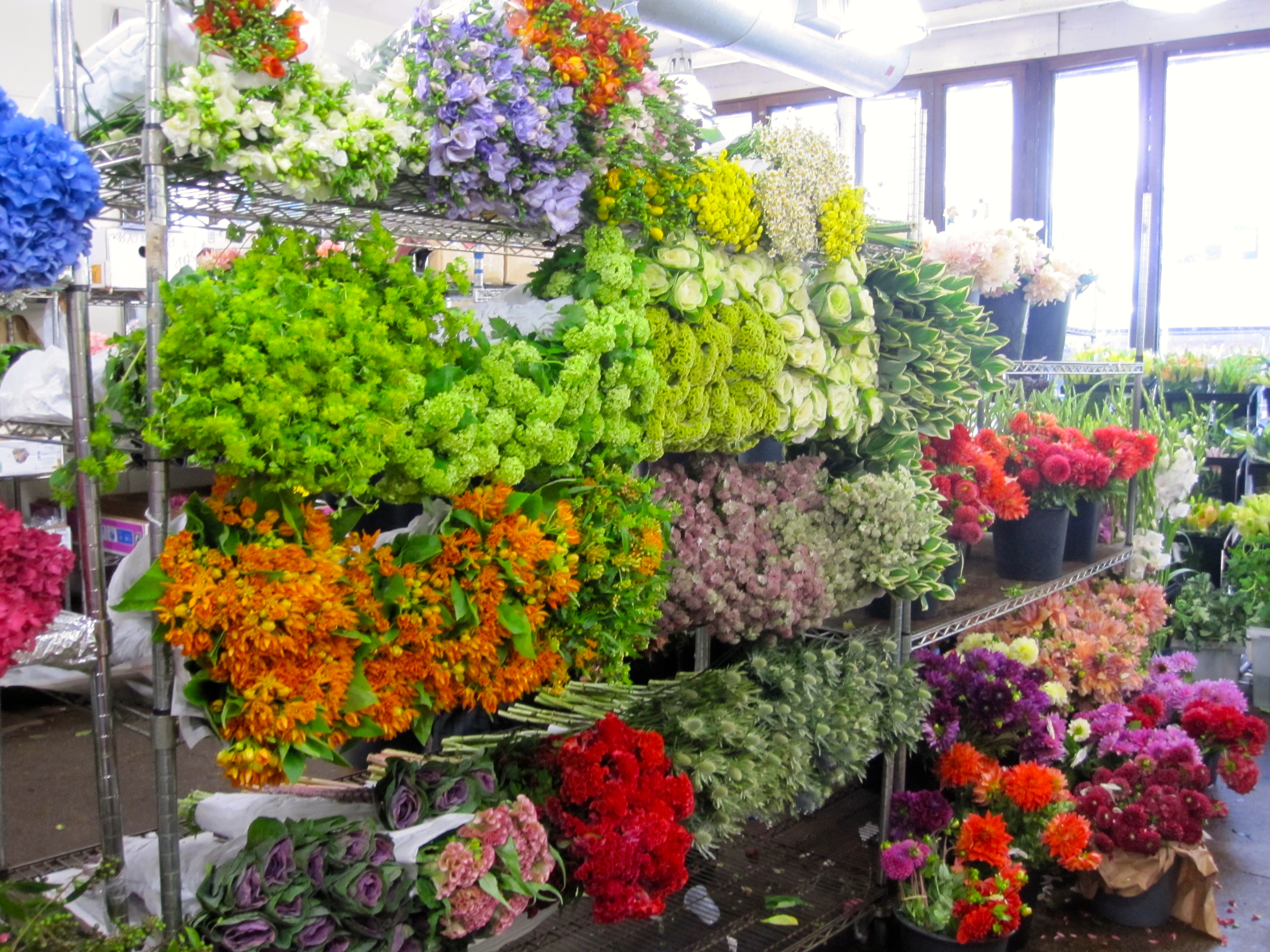 I thought it was such a great idea when Christina told me that she wanted to make the bouquets and boutonnières herself for the wedding. I’ve never thought about buying flowers to arrange myself, so I was interested in visiting the Chelsea Flower Market to see what a wholesale flower market has to offer. The Market opens very early – at 5AM which is usually when professionals such as retailers and event planners stop by and closes at 11AM. I wasn’t really sure what to expect. When I think of a market, I think of the ones that take place during the weekend in Antwerp. At the markets I’m used to, vendors set up tables and kiosks outside in an open area and sell their product. But the Chelsea Flower Market is basically one street filled with flower shops that specialize in certain type of plants, aka roses, exotic, potted, orchids, etc. You can browse outside the shop or in their freezing interiors (if you visit be sure to bring a sweater!) in order to find the perfect pieces to make your arrangement. We spent over an hour visiting every shop to find Christina’s dream flowers 🙂